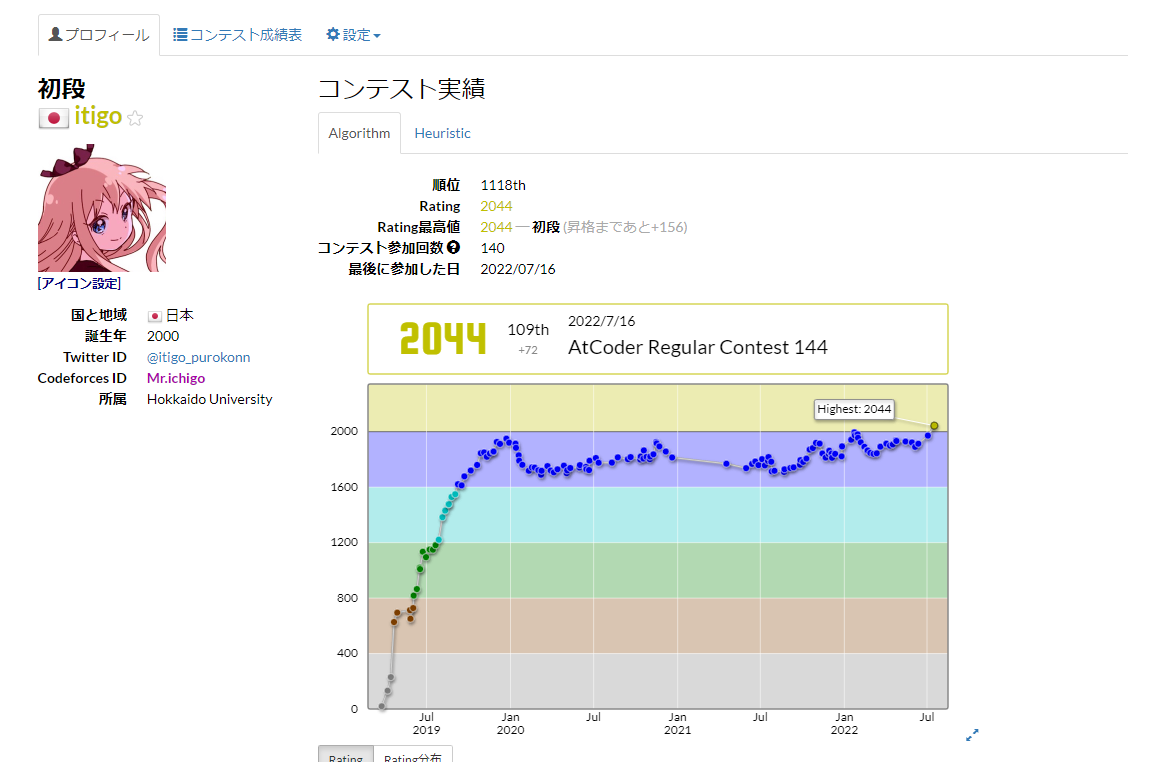 僕の名前はitigo、北海道大学M1、ギリギリ黄色の競プロer