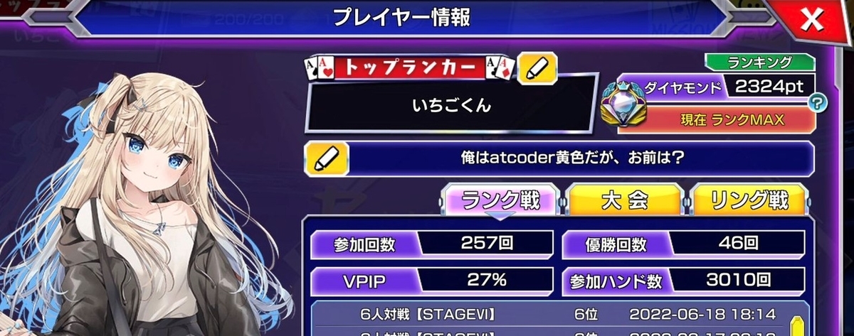 また、コドゲには「リーグ」と呼ばれるものがあり、最初はWood2リーグから始まり各リーグのBOSSより上のレートになる(要はそのリーグで1位になる)と上のリーグに昇格できます